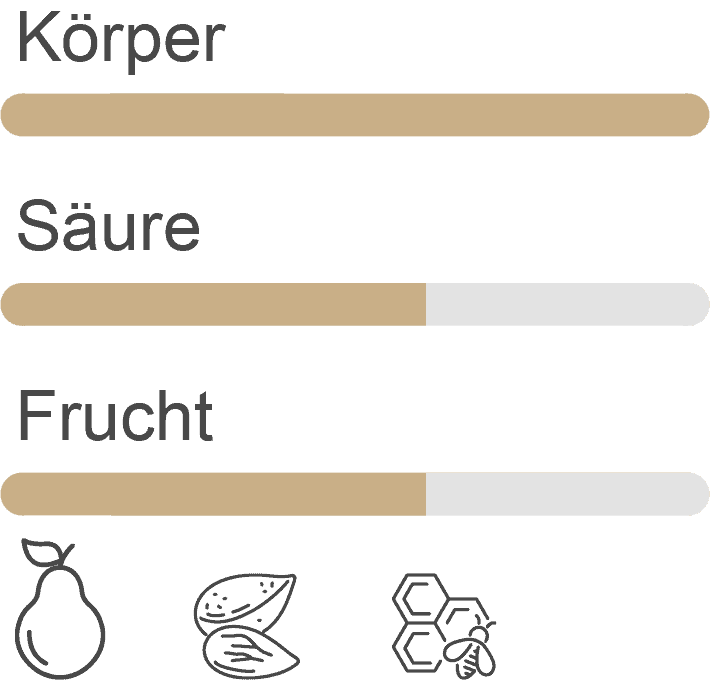 Ce vin de terroir aux multiples facettes, issu de vignes de plus de 40 ans, fait partie des premières spécialités de notre entreprise familiale. Le chardonnay élevé sous bois fait tout simplement plaisir - surtout avec du risotto, des asperges ou du veau. Complexe et élégant. Notes flatteuses de miel, de vanille discrète et d'amande amère. Soyeux en bouche avec des arômes de poire Williams. Un vin avec un potentiel de garde.